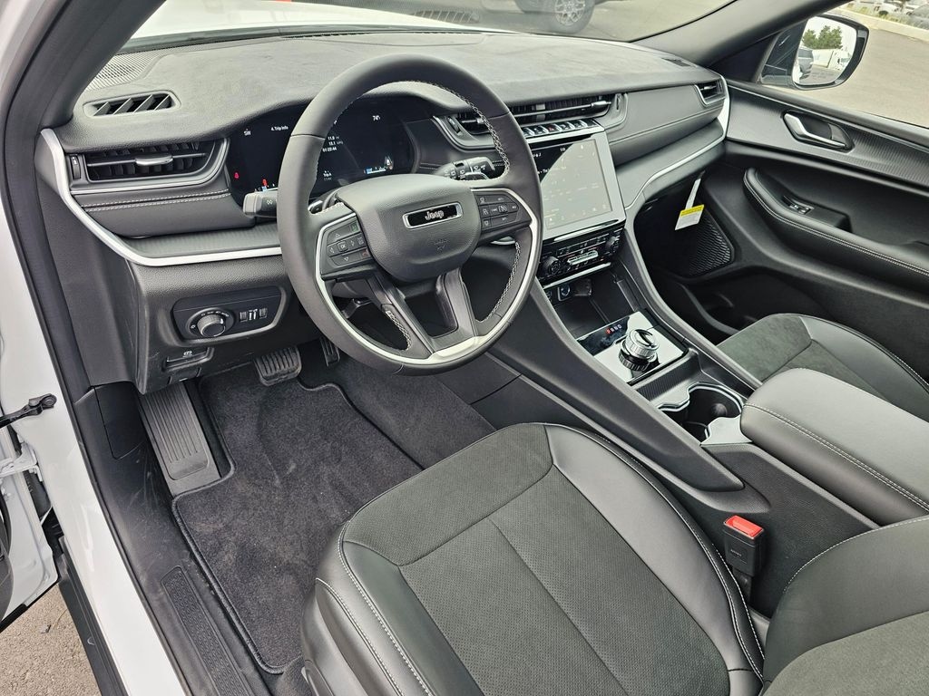 Interior: Capri leatherette/suede seats, 8-way power driver seat, 4-way manual front passenger seat, 2nd-row 60/40 bench with manual tip/slide, 3rd-row 50/50 folding seats, 7-passenger seating, 3-zone climate control, Uconnect 5 8.4 touchscreen, 10.25 driver display, Apple CarPlay/Android Auto, Jeep Connect trial, 6-speaker audio, wireless charging, full media hub with USB/Aux ports, illuminated cupholders.